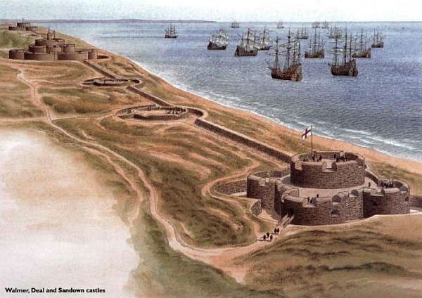 Rysunek trzech zamków Henryka VIII - Walmer, Deal i Sandown.