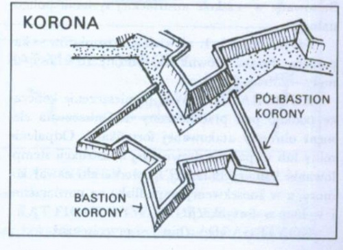 "Dzieło koronowe to dwa fronty bastionowe z dowieszonymi skrzydłami".