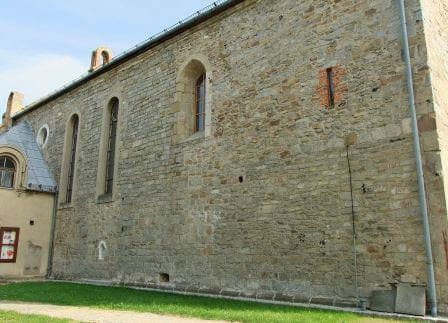 Romański z ok. poł. XIII wieku. Zbudowany z ciosów granitowych jako jednonawowy z wydzielonym prezbiterium zakończonym ścianą prostą i wieżą zachodnią osadzoną nad nawą. Wielokrotnie przebudowywany, zniszczony w 1945 roku pozostawał w ruinie. Odbudowany w ostatnich dwóch dekadach XX wieku, z zachowaniem elementów pierwotnych w zachodniej części nawy. Zachowane trójdzielne pomieszczenie podwieżowe oraz 2 częściowo zrekonstruowane okna w nawie. W kruchcie przed wieżą wtórnie osadzone kolumienki przezrocza wieżowego. (fot. wrzesień 2011-2012).