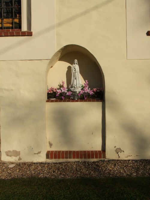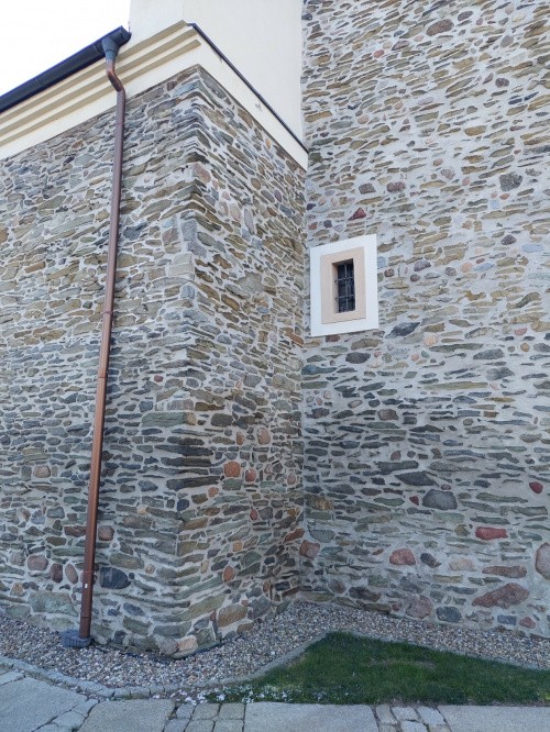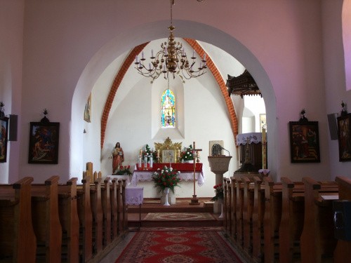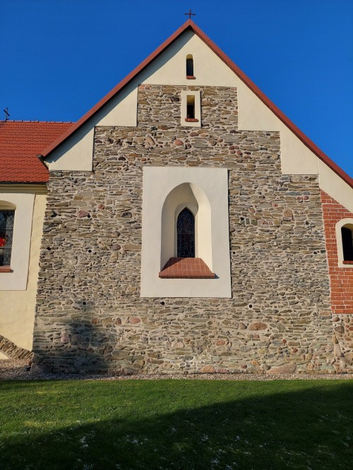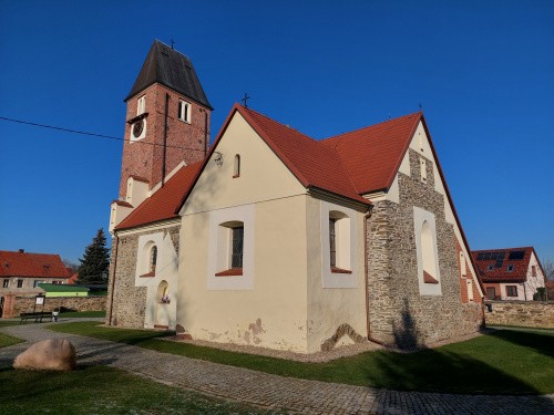 Romański, z 2 ćw. XIII wieku zbudowany z łamanego kamienia składał się z prostokątnej nawy i niemal kwadratowego sklepionego krzyżowo prezbiterium zakończonego ścianą prostą. Od zachodu wieża otwarta na nawę, w której znajdowała się empora. Zachowane mury zewnętrzne, ściana tęczowa, sklepienie prezbiterium oraz zarys portalu w południowej ścianie nawy. Kozaczewski nadto wspomina o śladach pierwotnych okien w ścianie wschodniej prezbiterium i południowej ścianie nawy, ale po pięknej konserwacji nic nie widać.