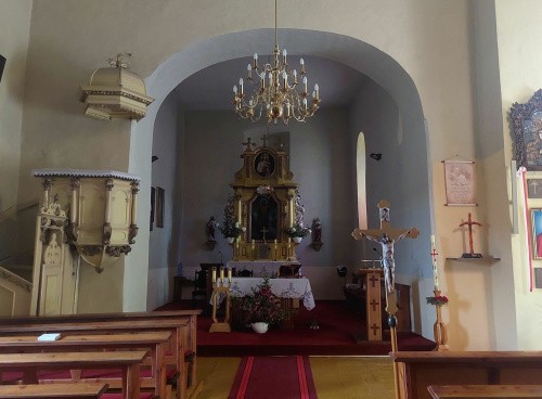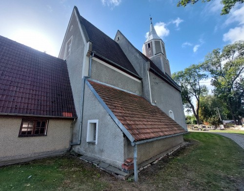 Zbudowany w 4 ćw. XIII wieku z łamanego kamienia składał się z prostokątnej nawy i prezbiterium oraz wieży zachodniej otwartej na nawę. Przy północnej ścianie prezbiterium sklepiona zakrystia. Prezbiterium i nawa kryte stropem. Zachowane mury zewnętrzne bez części ściany południowej nawy, przekształcona ściana tęczowa i portal do zakrystii. W zakrystii pierwotne sklepienie i okno szczelinowe. Nie było problemów ze zdjęciami.