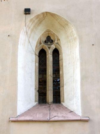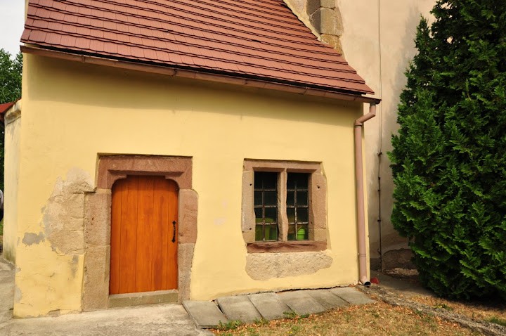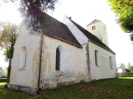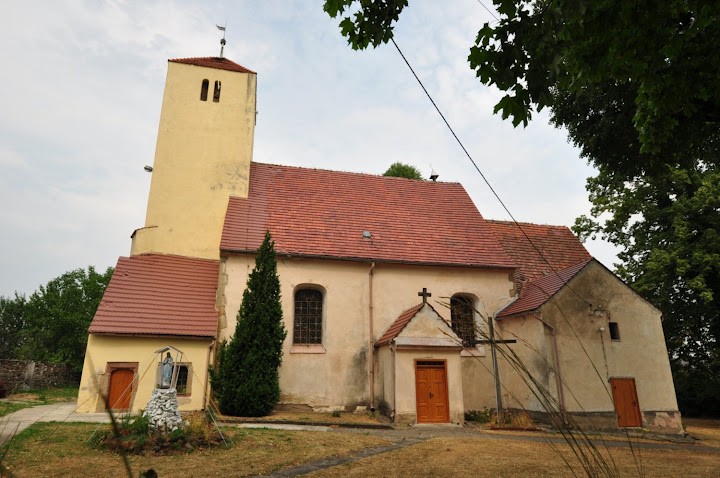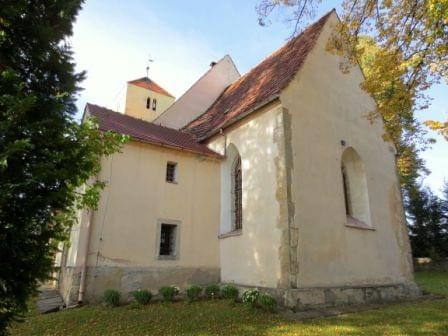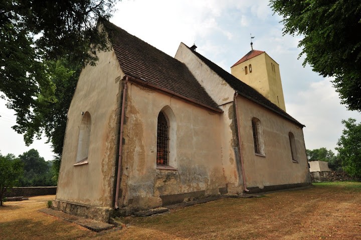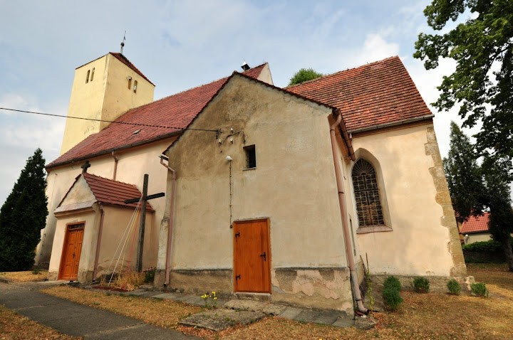 Zbudowany w 4 ćw. XIII wieku z łamanego kamienia i ciosów w narożach składał się z prostokątnej nawy i dwuprzęsłowego sklepionego prezbiterium. Z pierwotnego założenia przetrwały mury obwodowe ze ścianą tęczową, sklepienie prezbiterium krzyżowo-żebrowe z geometrycznymi wspornikami oraz centralnymi służkami, okno wschodnie z maswerkiem oraz dwa portale południowe: do nawy i do prezbiterium (ob. do zakrystii). Kościół był zamknięty. (fot. październik 2014)