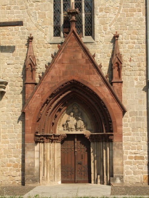 Kościół Wniebowzięcia NMP. Romański, zbudowany w 3 ćw. XIII wieku z ciosów piaskowca jako trójnawowa bazylika z dwoma wieżami przy fasadzie zachodniej. Z pierwotnego założenia zachowana jedynie ściana zachodnia z wieżami oraz zamurowanym okulusem, sklepione pomieszczenie międzywieżowe z arkadowymi przejściami do obu wież. W fasadzie zachodniej bogato zdobiony portal z czerwonego piaskowca (w XIX wieku wymieniono znaczą część elementów) oraz 2 szczelinowe okienka w północnej wieży. Drugi portal, zapewne również pochodzący z czasów budowy zachował się na chórze w przejściu do jednej z wież. Kościół jest okamerowany i otwarty, jednakże wstępu na chór muzyczny brak. (lipiec 2020)