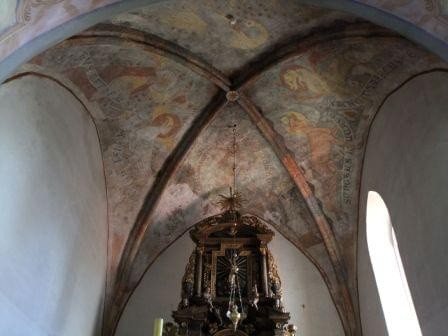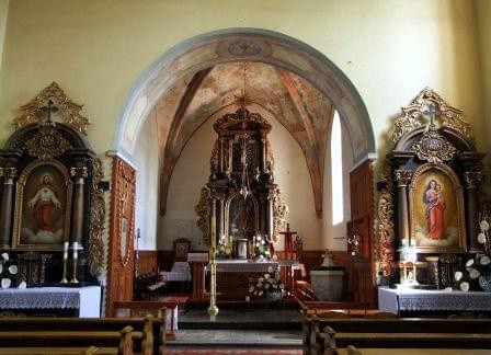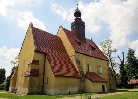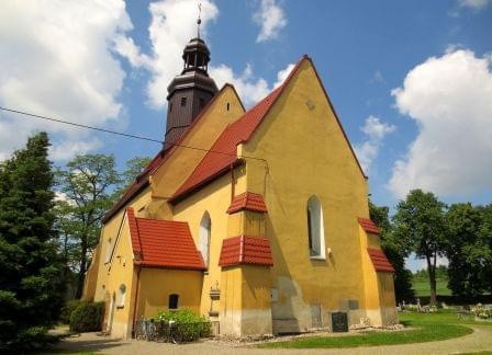 Zbudowany w 3 ćw. XIII wieku (przed 1268) z łamanego kamienia składał się z prostokątnej nawy, sklepionego prezbiterium i zakrystii po północnej stronie. Zarówno mury nawy i prezbiterium wzmacniały charakterystyczne masywne przypory sięgające 3/4 wysokości ściany. Z pierwotnego założenia przetrwały mury obwodowe ze ścianą tęczową, krzyżowo-żebrowe sklepienie prezbiterium z ciekawie zdobionymi wspornikami, okna wschodnie prezbiterium i zakrystii oraz 3 portale – południowe do nawy i prezbiterium oraz z prezbiterium do zakrystii. Warto także zwrócić uwagę na niestety zniszczone już wsporniki wschodniego szczytu prezbiterium. Zdjęcia robiłem po mszy, nikt nie robił problemów, choć tempo zamykania kościoła było odwrotnie proporcjonalne do tempa prowadzenia mszy.. ot, taki polski katolicyzm. (fot. sierpień 2014)