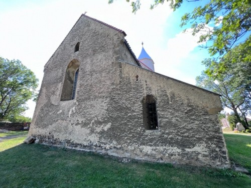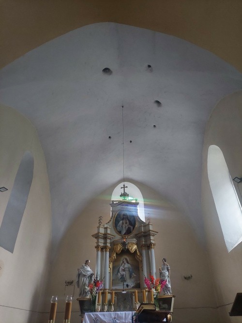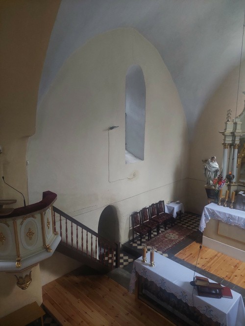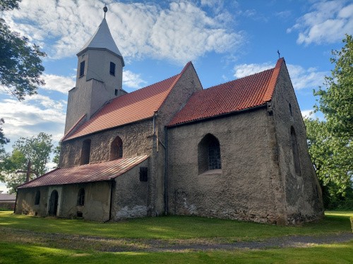 Romański, zbudowany w 2 ćw. XIII wieku z łamanego kamienia jako jednonawowy ze sklepionym prezbiterium zamkniętym ścianą prostą. Z pierwotnego założenia zachowane mury zewnętrzne, ściana tęczowa oraz bezżebrowe sklepienie prezbiterium z widocznymi szyjkami naczyń akustycznych. W ścianie południowej nawy wnęka na schody prowadzące na lektorium, pierwotne okna w ścianie północnej nawy i północnej oraz wschodniej prezbiterium. Portal zachodni w kruchcie, portal w południowej ścianie prezbiterium obecnie zamurowany. Zdjęcia robione po mszy, bez problemów.