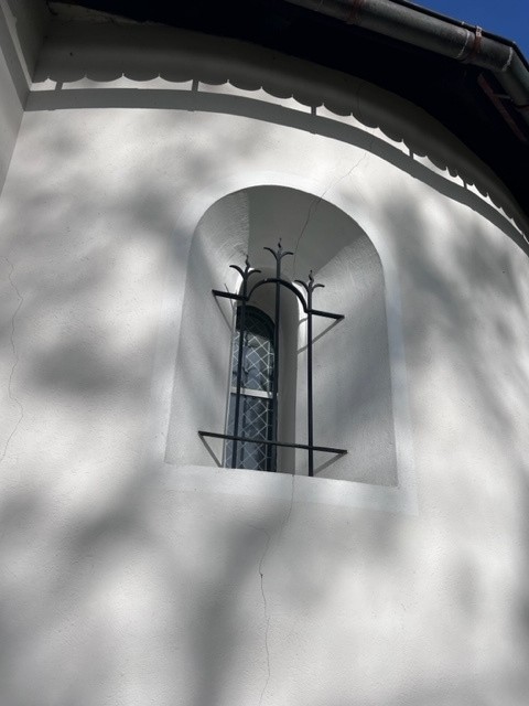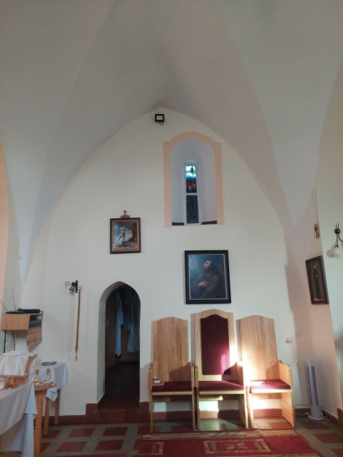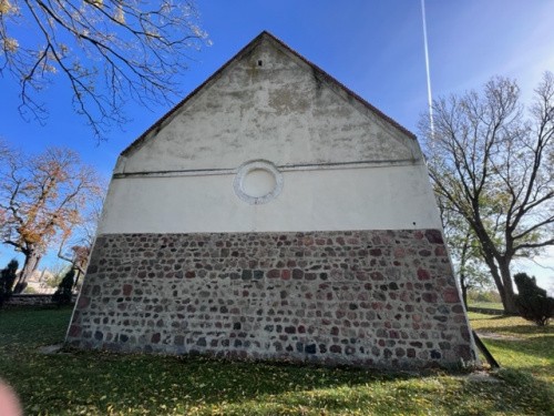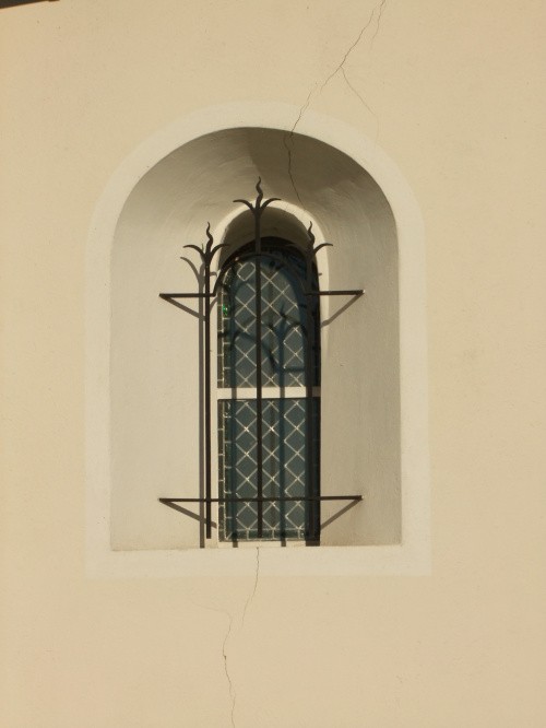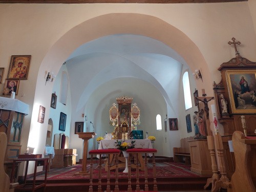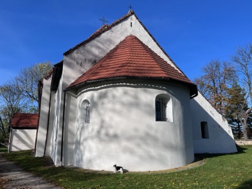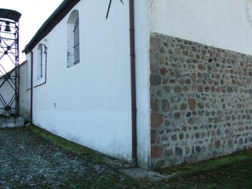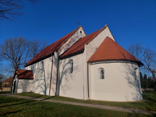 Romański, z II ćw. XIII wieku, zbudowany z łamanego kamienia składał się z prostokątnej nawy i prezbiterium zakończonego apsydą. Z pierwotnego założenia zachowane mury zewnętrzne, ściana tęczowa, bezżebrowe sklepienie krzyżowe prezbiterium oraz konchowe apsydy, a także okna w apsydzie i północnej ścianie prezbiterium (widoczne tylko od wewnątrz). Śladów zamurowanego portalu - wykonanego z cegły - w płn. ścianie nawy nie widać.