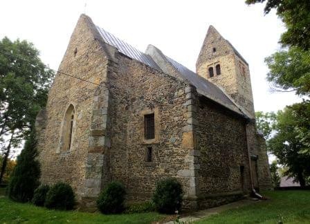 Romański, zbudowany w 3 ćw. XIII wieku z łamanego kamienia i ciosów granitu w narożach składał się z prostokątnej nawy, sklepionego kwadratowego prezbiterium i zakrystii po północnej stronie. W nawie znajdowała się drewniana empora po której pozostały tylko wsporniki. Z pierwotnej budowli pozostały mury zewnętrzne, ściana tęczowa z gzymsem impostowym i krzyżowo-żebrowe sklepienie prezbiterium wsparte na kolumienkowych służkach. We wschodniej ścianie prezbiterium zachowane pierwotne okno ze zrekonstruowanym maswerkiem, w północnej ścianie nawy wtórnie użyte XII-wieczne biforium. W kościele zachowały się też 3 pierwotne portale. Najbardziej okazały, w południowej ścianie nawy z wmurowanymi trzema XII-wiecznymi rzeźbami lwów oraz bogato zdobionym tympanonem. Portal z prezbiterium do zakrystii współczesny budowie, nie jest typowo romański, ale bardzo interesujący, ot taka prostokątna dziura w ścianie z ćwierćkolistymi wspornikami. Podobny portal ponoć zachował się na strychu w przejściu znad nawy do prezbiterium, ale nie było mi go dane zobaczyć, podobnie jak czterolistnego okulusa schowanego gdzieś za murami wieży. Cały kościół obiega fazowany cokół.