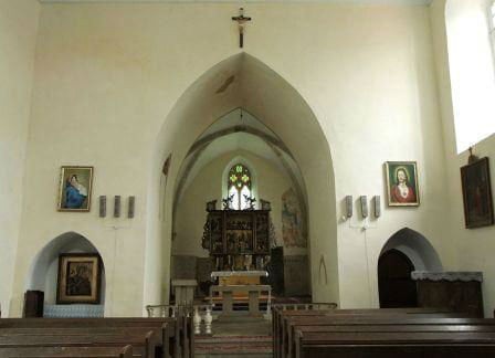 Dwuprzęsłowe sklepione krzyżowo-żebrowo prezbiterium, nawa kryta pułapem. Na łączeniu nawy i prezbiterium, po obu stronach ściany tęczowej dwie ok. 16 metrowej wysokości wieże.