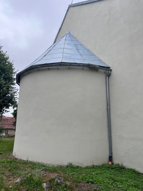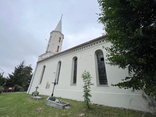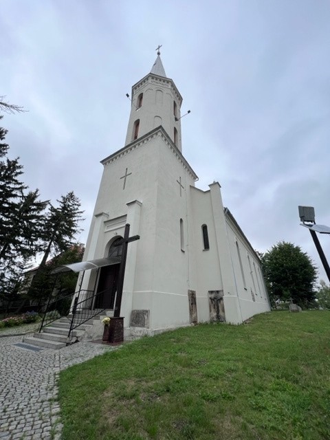 Założenie kościoła filialnego z cmentarzem otoczonym kamiennym murem (z łupka) oraz zagrodą plebańską znajduje się w północnej części wsi, w rozwidleniu dróg w kierunku Budziszowa Małego, Środy Śląskiej i Jarosławia.
