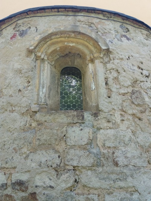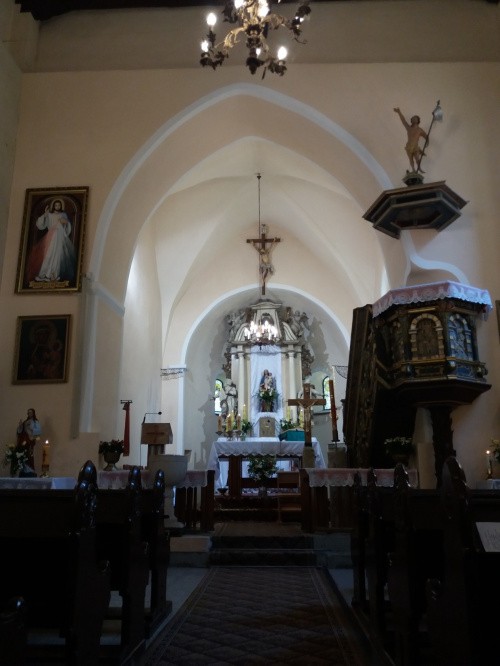 Romański, zbudowany w II ćw. XIII wieku, składał się z prostokątnej nawy i prostokątnego prezbiterium zakończonego apsydą. Jako budulca użyto zgrubsza obrobionych granitowych ciosów. W prezbiterium bezżebrowe sklepienie krzyżowe. Z detalu zachowane okno w apsydzie oraz portal południowy do nawy, także sklepienie i łuk tęczowy z gzymsem impostowym. Wg literatury częściowo zachowane są okna w północnej ścianie nawy i prezbiterium, ale ja ich nie widziałem, być może znajdują się ponad stropem przybudówek. Przemiły ksiądz nie robił żadnych problemów ze zdjęciami. (fot. czerwiec 2020)