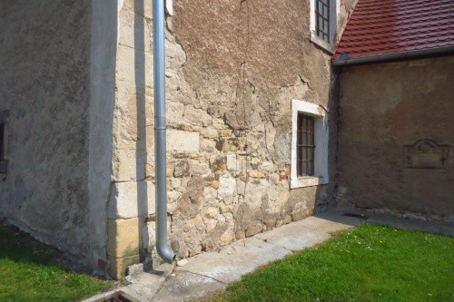 Obdrapany tynk i kamienie w nawie