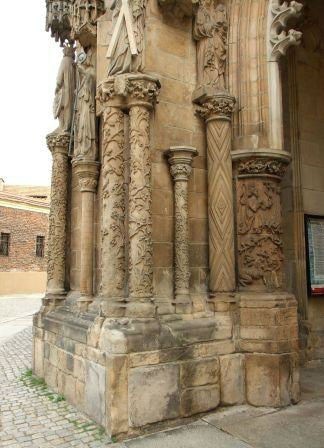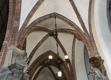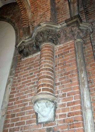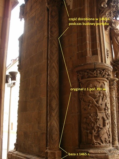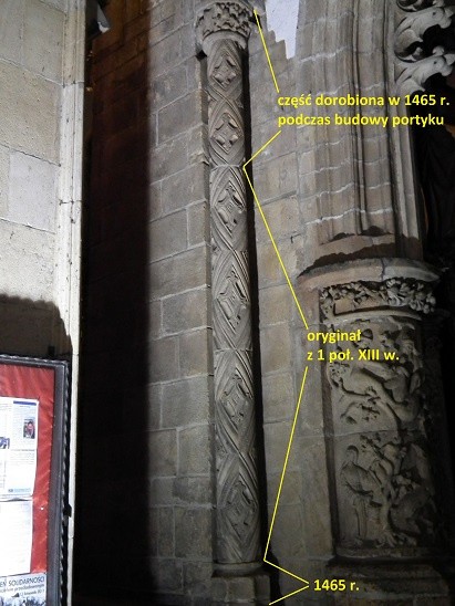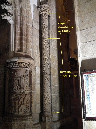 Wg tych ustaleń, jest tam 5 trzonów kolumn romańskich (1 poł. XIII w.), w tym dwa ("cienkie") są dosztukowane (przedłużone) w XV w. Reszta jest późnogotycka, a jedna nawet nowożytna, imitująca romańską!!!