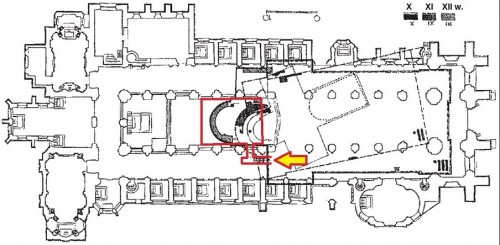 korytarz schodzi do zakrętu w prawo, gdzie jest kolejna bariera - krata, niestety zamknięta. Przez pręty tej kraty można zrobić zdjęcie, ale ponieważ korytarz za zakrętem jeszcze biegnie przez kilka metrów, to widać jedynie wycinek krypty w otworze końcowym. Na szczęście jest to "konkretny" wycinek z apsydą XI-wieczną i ławą fundamentową pod późniejsze kolumny na pierwszym planie. Na nieszczęście w krypcie panują ciemności, a korytarz jest oświetlony - duży kontrast. Ja podczas pobytu miałem tylko dość prymitywny kompakt, ale lepszym aparatem zapewne można "wyzumować" znacznie lepsze fotki z tego miejsca. Załączam planiki z zaznaczonym zejściem i miejscem, skąd robiłem zdjęcia.