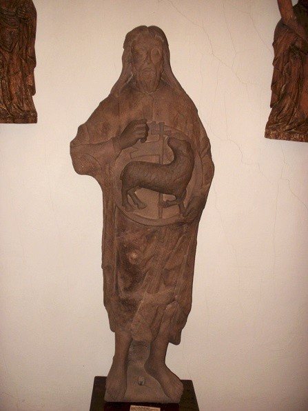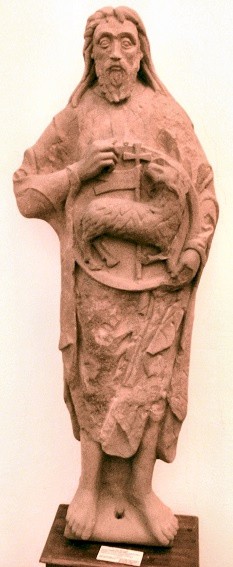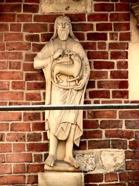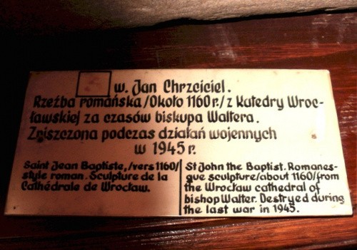 Św. Jan Chrzciciel - patron katedry i de facto przez wieki symbol Wrocławia, rzeźba z romańskiej katedry (zapewne z jej fasady?). Tu: kopia na północnej ścianie obecnej katedry.