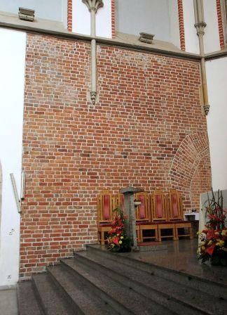 A to wydaje się być pierwotna ściana wschodnia prezbiterium, którą widać w kawiarni mieszczącej się pod prezbiterium.
