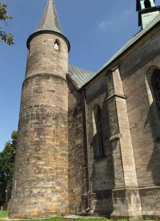 Pierwsza wzmianka o kościele pochodzi z 1191 r. Wybudowano go na podgrodziu z miejscowego kamienia. Należy przypuszczać, że włączony był do systemu obronnego grodu żarnowskiego. Pierwotnie kościół był jednonawowy, zbudowany w stylu romańskim. Miał charakter obronny, wąskie, wysoko umieszczone okna i masywną wieżę. W 1510 r. kościół powiększono o późnogotyckie prezbiterium. W l. 1903-17 został przebudowany przez arch. Stefana Szyllera. Obecnie jest czteronawowy. Z dawnego romańskiego kościoła zachowało się m.in. zach. Przęsło dawnej nawy wraz z emporą, okrągła wieża oraz kamienny płasko-rzeźbiony ołtarz z końca XVI w. Na szczególną uwagę zasługuje wspomniana empora, która z reguły występowała w kościołach fundowanych przez możnowładców. W jej pn. ścianie zachował się dotąd otwór drzwiowy, który pierwotnie prowadził poprzez drewnianą galeryjkę do grodu. (źr: http://www.opocznianie.pl)