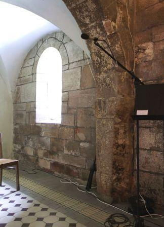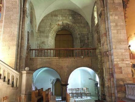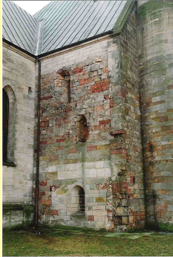 Południowa i północna ściana kościoła romańskiego z oknami, widoczny także półfilar empory.