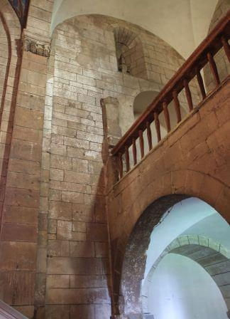 schody na emporę - widać wielowiekowe wytarcia stopni, a u góry po lewej - rozglifione okienko szczelinowe