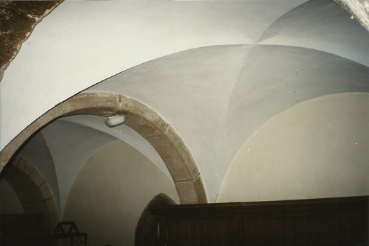 Dwa sklepienia krzyżowe empory - nie wiem, czy oryginalne (?), ale z pewnością jak oryginalne. Na dole, za ławą gotycki portal do wieży(od str. wieży jest romański)