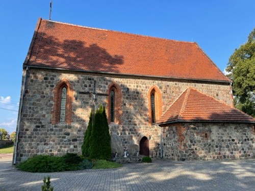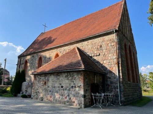 Zachowały się pierwotne okna szczelinowe, po trzy od wschodu, północy i południa, trzy portale (z których zachodni portal uskokowy posiada reprezentacyjnych charakter) i dekorowane blendami szczyty. Wewnątrz kościoła, na ścianie wschodniej poddasza zachowała się polichromia z około 1350 r., przedstawiająca scenę Ukrzyżowania[15]. Wpisany do rejestru zabytków, nr 10 z 26.10.1976. Przy kościele znajdują się resztki poewangelickiego cmentarza w formie lapidarium.