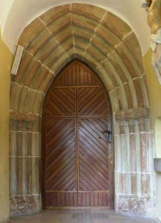 oraz portal łączący cechy romańskie i wczesnogotyckie w południowej ścianie nawy.