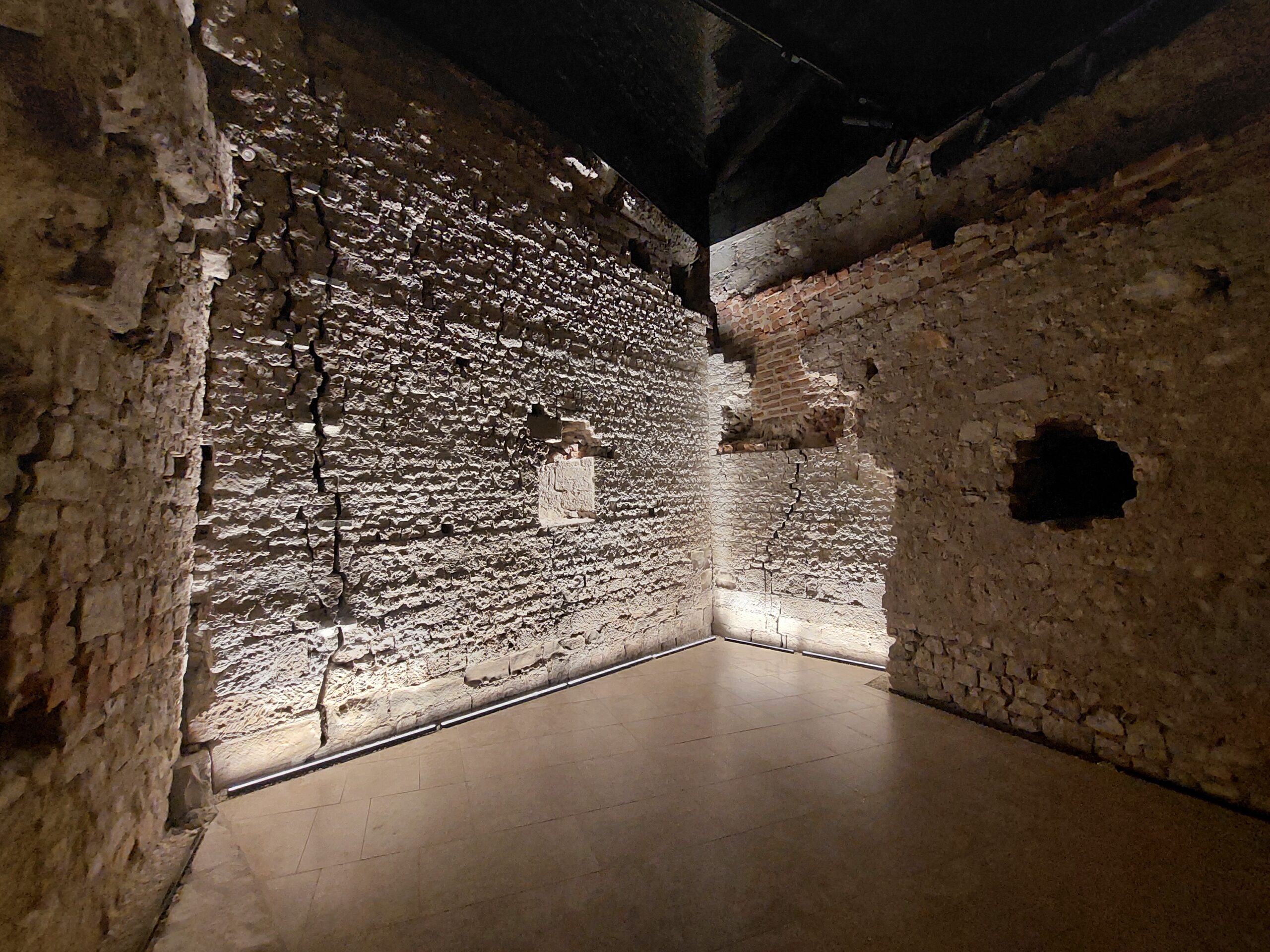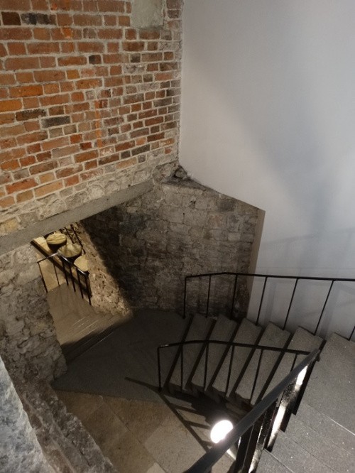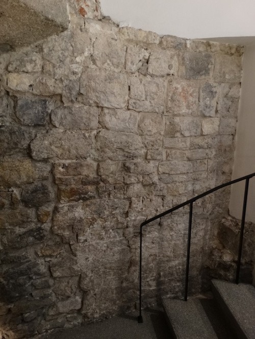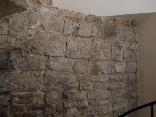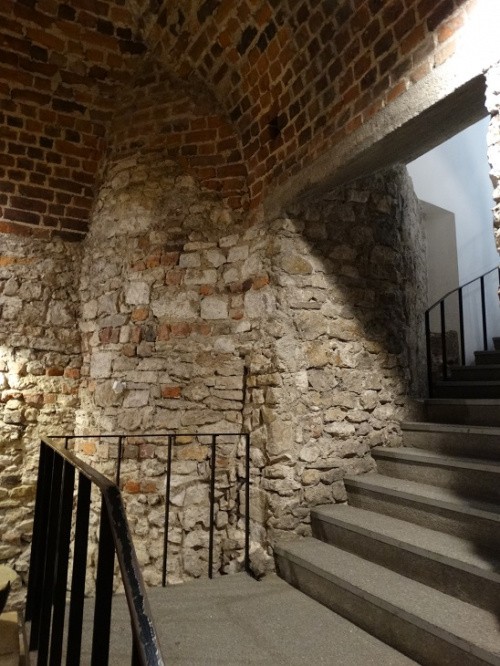 Od wnętrza Zbrojowni - oryginalny mur po prawej w głębi - reszta "stołpu", w tym ściana północno-zachodnia całkowicie obmurowana późniejszymi wątkami