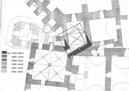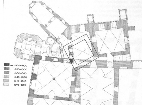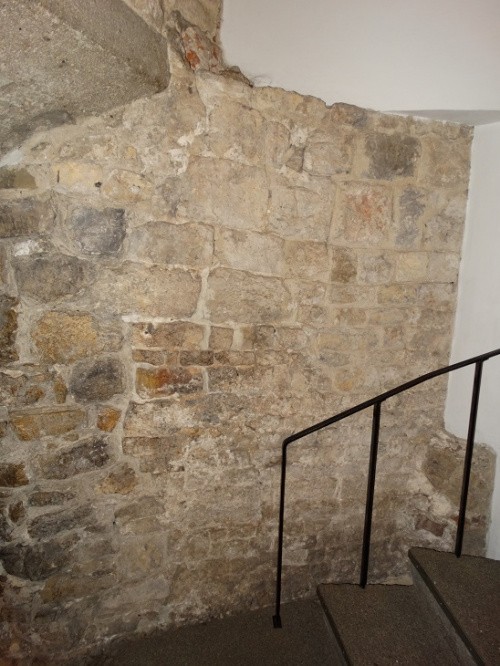 14. Skarbiec, zewnętrzny mur sali ze Szczebcem - ukośna ściana z portalem kryje mur "stołpu"