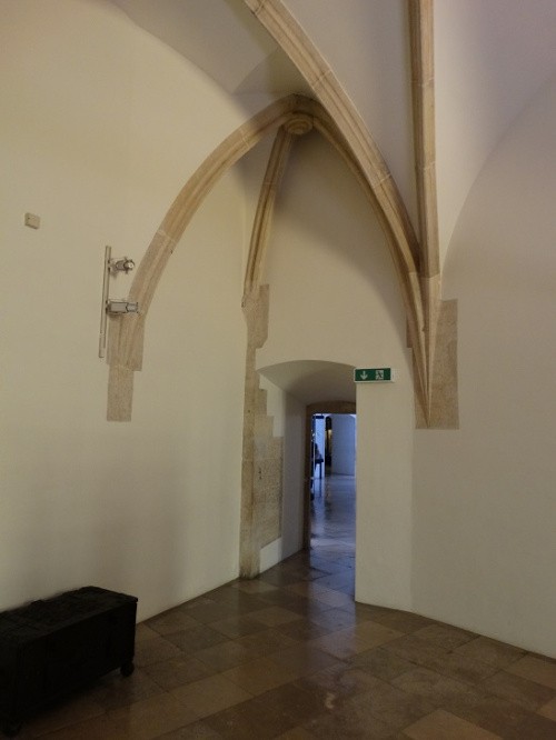 13. Skarbiec, gotycka sala ze Szczerbcem (obecnie parter zamku) - ukośna ścianka z portalem to pozostałość murów "stołpu", dziś całkowicie tu obmurowanego
