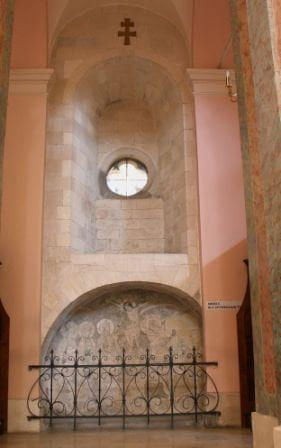 Fragment romańskiej ściany z wnęką i zrekonstruowaną czterolistną rozetką w zachodniej ścianie kościoła, widoczny jedynie od wewnątrz.