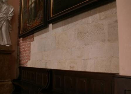 2 fragmenty murów ciosowych w ścianach prezbiterium wewnątrz kościoła.