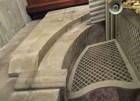 I od wschodu. W prezbiterium lekko zakrzywione ciosy z rozebranej apsydy wschodniej
