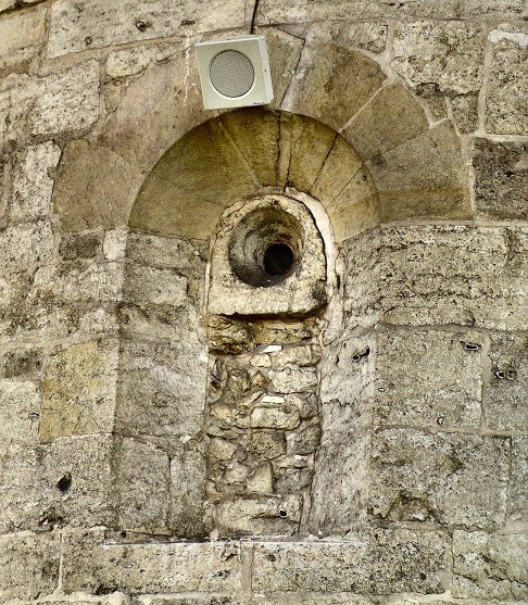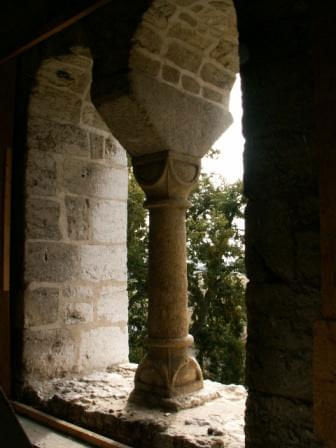 Okno absydy wschodniej z zachowaną górną częścią oryginalnego, romańskiego, kamiennego wypełnienia - ok. 1/3 z 1 otworem - bardzo rzadka u nas sprawa. Reszta okna wtórnie zamurowana. (głośnik nie jest romański)