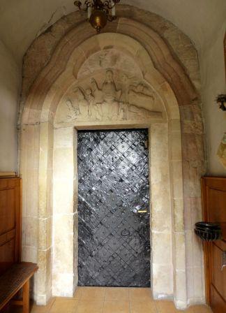 Słynna romańska rzeźba w kamiennej ramie na wschodniej fasadzie prezbiterium