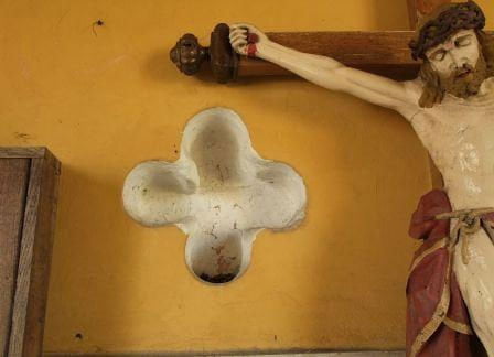 Podobno jest też kropielnica powstała z głowicy kolumny, ale tej akurat mimo usilnych poszukiwań z Kościelnym nie znaleźliśmy.