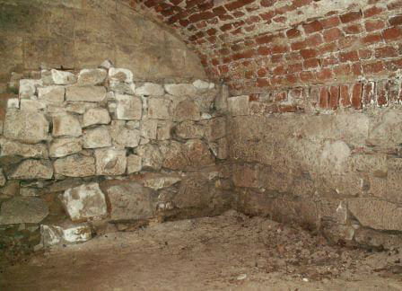 Zamurowane okno. Aby je zobaczyć, trzeba wejść na strych. Tamże kolejny odbity spod tynku mur.