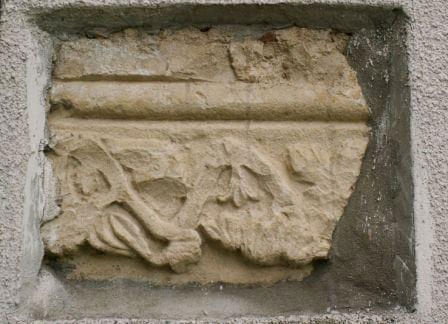 Na zewnątrz kościoła wmurowany fragment romańskiej dekoracji rzeźbiarskiej