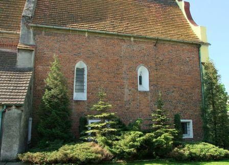W północnej ścianie nawy zachowane dwa częściowo zamurowane okna, także we wschodniej ścianie prezbiterium zarys zamurowanego okienka. W ścianie zachodniej portal ostrołukowy z kolumienkami.
