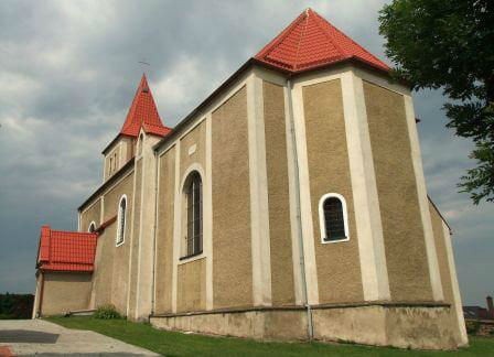 Kościół św. Jerzego Romański, zbudowany ok. poł. XIII wieku z łamanego kamienia, gruntownie przebudowany i częściowo wyburzony w XVII wieku zatracił cechy stylowe. Do dziś, z tego założenia zachowała się tylko nawa ze ścianą tęczową, a w niej, w północnym filarze - lektorium, z ukrytymi w grubości murów schodami. W kościele zachowały się również dwa portale, południowy do nawy, obecnie w kruchcie pełniącej rolę składzika, dostępny tylko gdy kościół jest otwarty, oraz wtórnie wmurowany w kruchtę południową portal prowadzący zapewne do prezbiterium. (fot. czerwiec 2012)