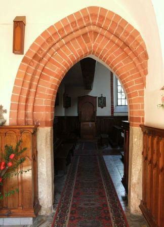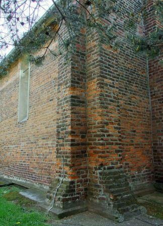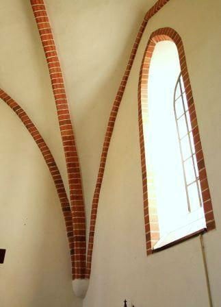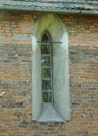 W południowej i północnej ścianie nawy zachowane po jednym pierwotnym oknie, kolejne w południowej ścianie prezbiterium. Pozostałe okna przemurowane. W ścianie południowej ostrołukowy portal z wałeczkiem i ozdobnymi guzami. Portal został wykonany z piaskowca, ale pomalowano go w ceglany wzór, na co wszyscy się nabierają.
