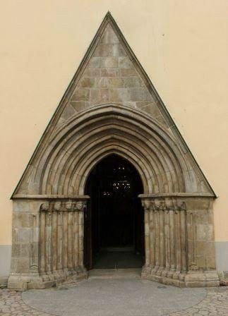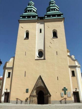 Kościół pod wezwaniem św. Wawrzyńca zbudowano około połowy XIII wieku z łamanego kamienia. Z pierwotnej budowli ostała się jedynie dwuwieżowa fasada zachodnia z dwiema parami obronnych okienek i portal zachodni. Korpus nawowy i prezbiterium zostały rozebrane w czasie barokowej rozbudowy. Trójuskokowy portal o cechach już wczesnogotyckich pozbawiony jest tympanonu. Trzony kolumienek i wałki archiwolty nie mają dekoracji, jedyną ozdobę stanowią umieszczone między archiwoltą a kolumienkami maski, których jest 8 i każda jest inna. Nie wiadomo, kogo przedstawiają.(fot. lipiec 2012)