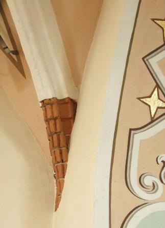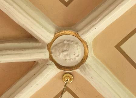 Z pierwotnego założenia najlepiej przetrwało pięcipolowe sklepienie prezbiterium z rzeźbionym zwornikiem. (fot. czerwiec 2012)