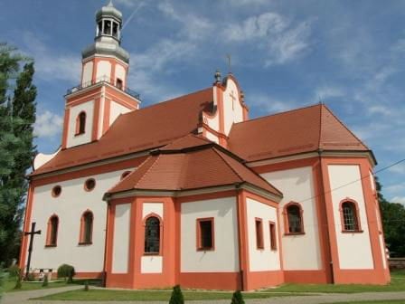 Zbudowany ok. poł. XIII wieku (1255 r.?) Z pierwotnego założenia zachowane jedynie mury zewnętrzne nawy z cegły w układzie wendyjskim wtopione w obecny barokowy, pstrokaty kościółek. (fot. czerwiec 2012)