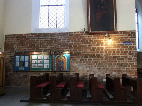 Prowadzone przez Niemców w czasie wojny wykopaliska odsłoniły pod posadzką i do wys. ok. 1 metra w obecnym kościele mury zewnętrzne naw bocznych w układzie wendyjskim (nawa pd) i gotyckim (nawa pn) oraz ściany zachodniej. Reliktem tej budowli ma być też zamurowana obecnie dolna część wąskiego okna w zachodnim przęśle nawy pn świadcząca o pierwotnym bazylikowym (obecna świątynia jest halą) układzie przestrzennym.