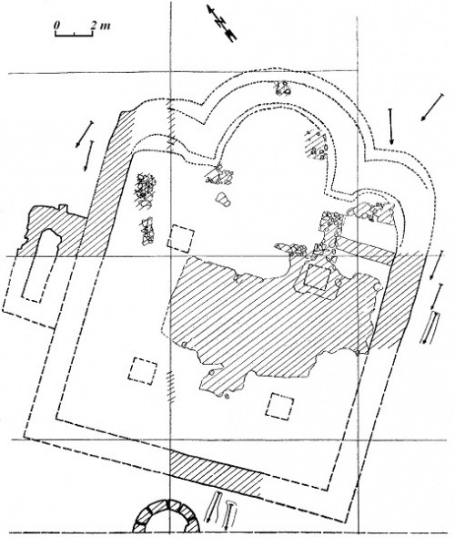 „Konfrontacja wyników badań wykopaliskowych z zapisami zawartymi w źródłach pisanych pozwoliła A. Żakiemu na interpretację odkrytych murów. Ustalił on, iż pochodzą z kościoła obrządku wschodniego fundacji księcia przemyskiego Wołodara, panującego w latach 1092-1124... Według niego była to budowla w przybliżeniu kwadratowa o wymiarach 18 x 22,5 m, z trzema apsydami od wschodu i co najmniej dwoma wejściami - od zachodu i od północy... Trójnawowy podział wewnętrzny wyznaczały dwie pary filarów dźwigające tambur, na którym spoczywała centralna kopuła. Obiekt wzniesiony został z ciosów wapiennych, których niewielką ilość znaleziono w trakcie wykopalisk. Wnętrze świątyni wyłożone było posadzką z płaskich kamieni piaskowca układanych w kręgi tworzące mozaikę. Autor przypuszczał, że niektóre partie mogły być pokryte płytkami ceramicznymi żółtej barwy...”.