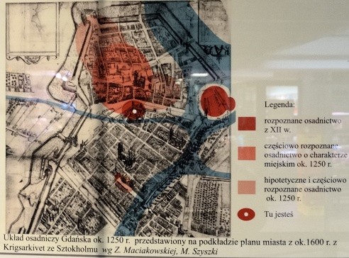 Fragment tablicy w dolnej kondygnacji Hali: "Układ osadniczy Gdańska ok. 1250 r.... wg Z. Maciakowskiej, M. Szyszki"