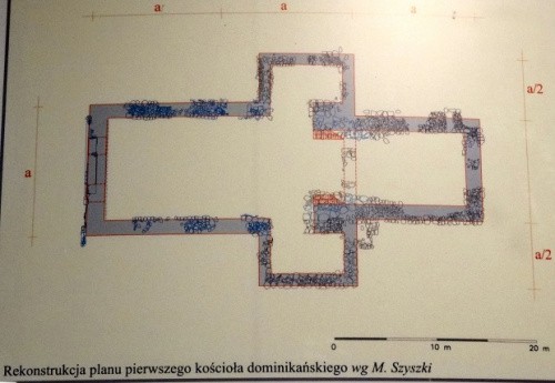 Fragment tablicy: "Rekonstrukcja planu pierwszego kościoła dominikańskiego wg M. Szyszki"