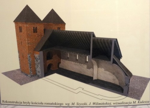 Fragment tablicy: "Rekonstrukcja bryły kościoła romańskiego wg M. Szyszki, J. Wilimińskiej, wizualizacja M. Kulesza"