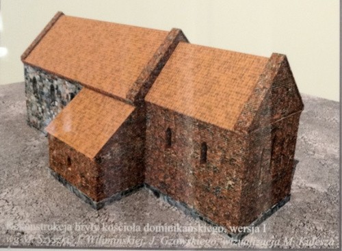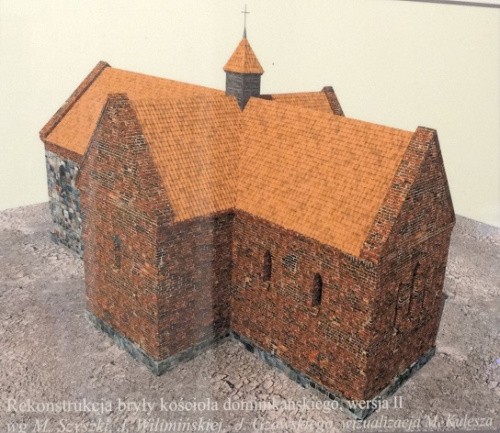 "Rekonstrukcja bryły kościoła dominikańskiego, wersja I, wg M. Szyszki, J. Wilimińskiej, J. Gzowskiego, wizualizacja M. Kulesza"