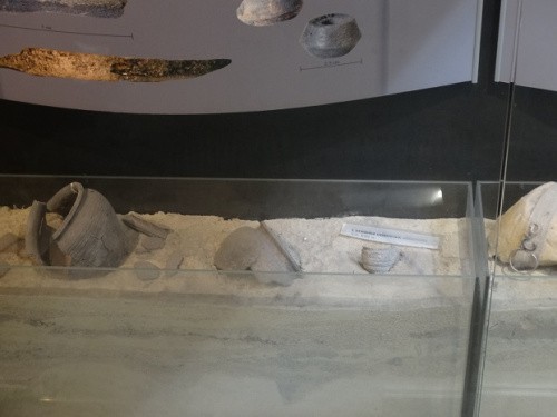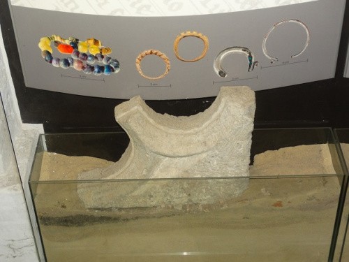 "W warstwie destrukcyjnej kościoła odnaleziono fragmenty murów masywu zachodniego, wśród nich prezentowany fragment rozglifień portalu i łęku"