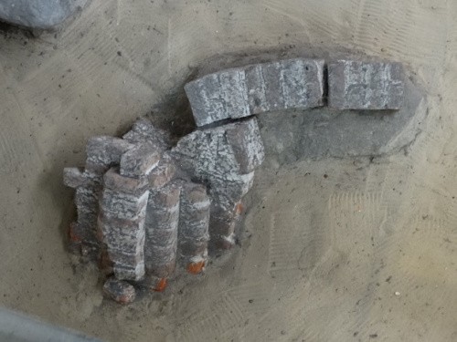 Fragment ceglanego portalu zachodniego - elementy łęku nadproża i węgarów - leżące w środku zachodniej części kościoła